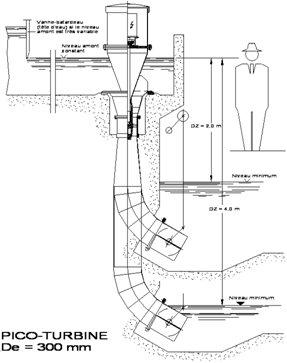 Les Pico turbines sont utilisées pour les très faibles chutes (de 1 à 5 mètres). Elles sont caractérisées par leur puissance allant de 1 à 10 kW. Elles conviennent aussi bien à des applications d’électrification de sites isolés et de seuils existants qu’à des réhabilitations d’anciens moulins.